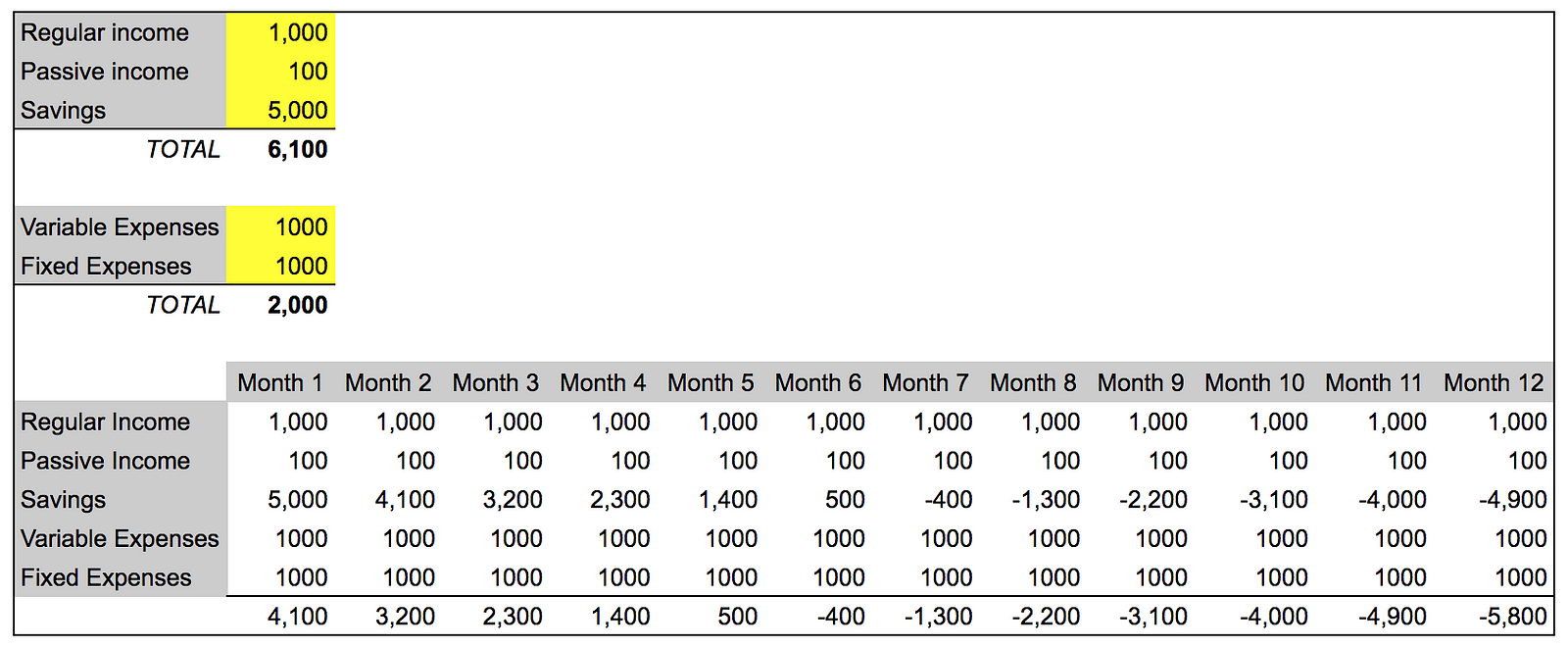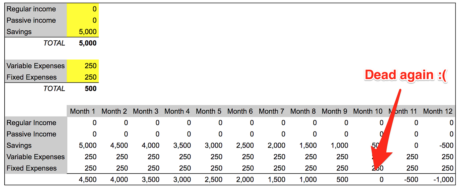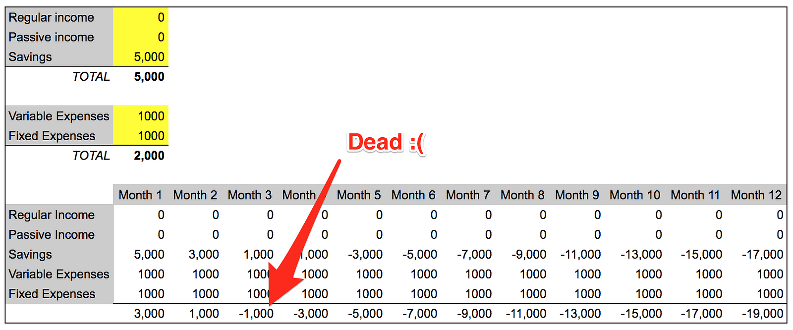 按照目前的消耗速度,您在第 3 个月就已经死了。让我们考虑一下您可以进行的一些调整: